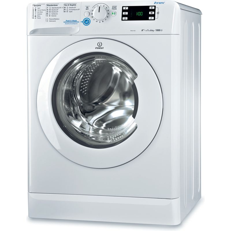Cechy wolnostojącej pralki ładowanej od przodu Indesit: przestronny bęben o pojemności 6 kg. Szybkie i skuteczne wirowanie z prędkością 1000 obrotów na minutę. Kolor biały.