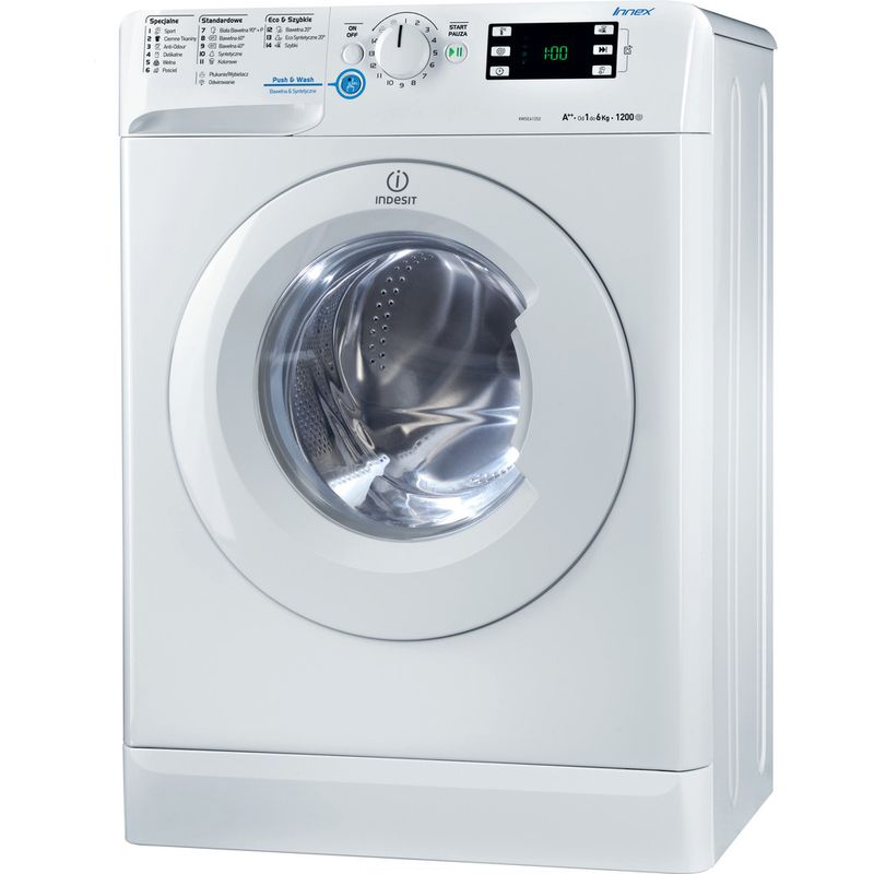 Cechy wolnostojącej pralki ładowanej od przodu Indesit: przestronny bęben o pojemności 6 kg. Szybkie i skuteczne wirowanie z prędkością 1200 obrotów na minutę. Kolor biały.