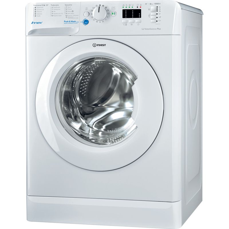 Cechy wolnostojącej pralki ładowanej od przodu Indesit: przestronny bęben o pojemności 6 kg. Szybkie i skuteczne wirowanie z prędkością 1000 obrotów na minutę. Kolor biały.