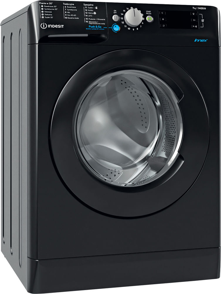 Cechy wolnostojącej pralki ładowanej od przodu Indesit: przestronny bęben o pojemności 7,0 kg. Szybkie i skuteczne wirowanie z prędkością 1400 obrotów na minutę. Kolor czarny.