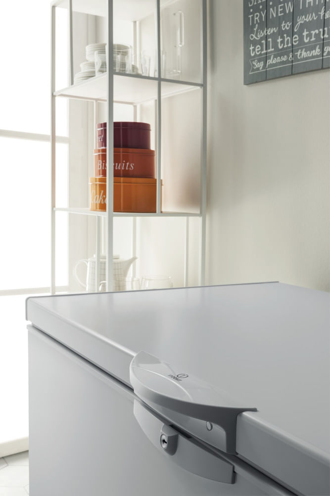 Cechy wolnostojącej zamrażarki skrzyniowej Indesit: kolor biały.